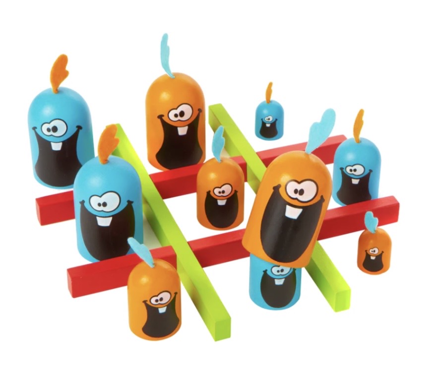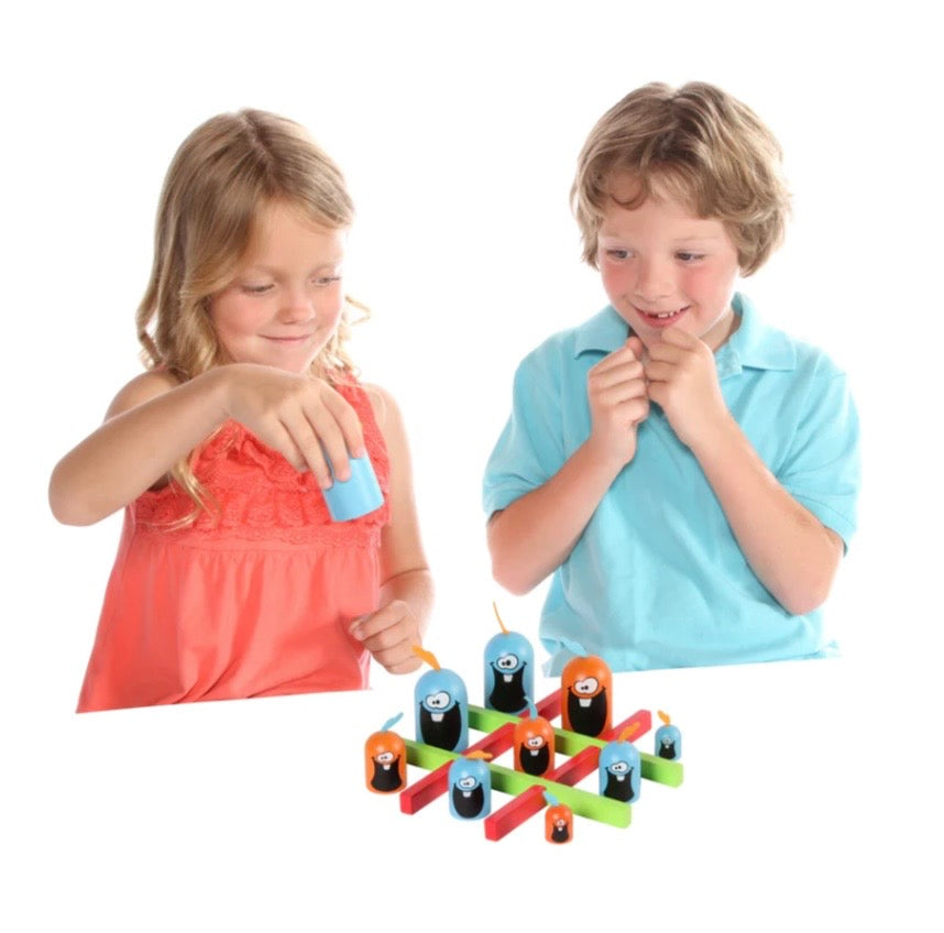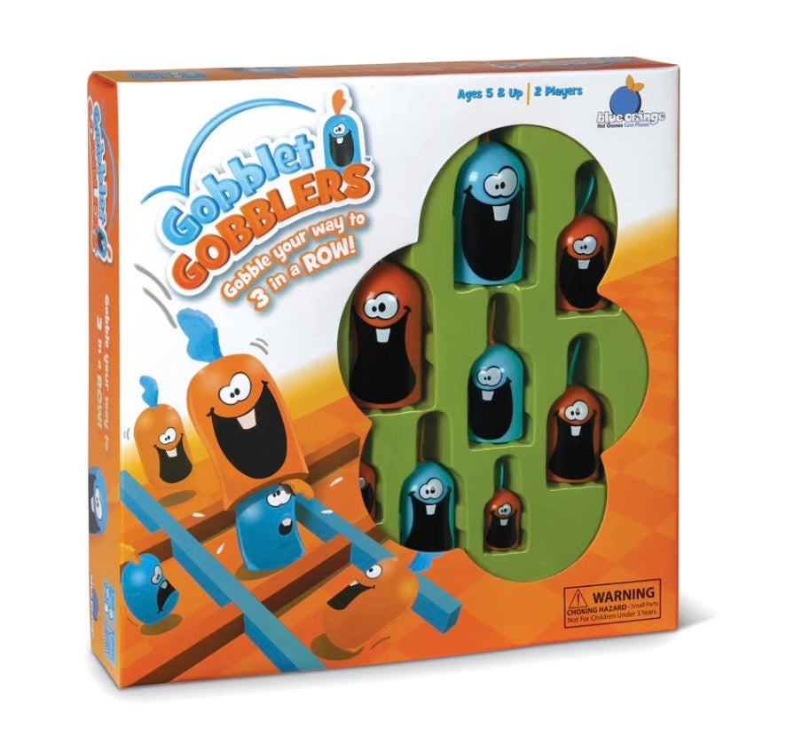 Test your memory and appetite for laughs with this easy to learn and quick game of strategy. Don't let the cute game pieces fool you because they can gobble you up and change your strategy in the blink of an eye! Players will receive 6 whimsical game pieces, two large, two medium, and two small. This strategy game plays like the classic game of tic-tac-toe with some twists. The major difference is that you can gobble up your opponent's piece, if it is smaller than yours. With fun and colorful game pieces, children will love to play this game. The game twists on tic-tac-toe allow children to play a game that they know, while developing strategic skills for kids to challenge parents!